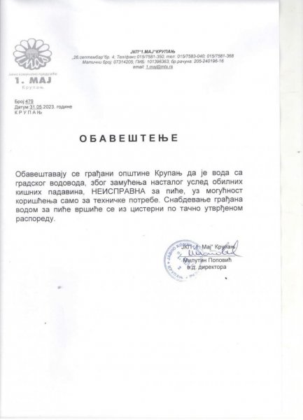 Јавно комунално предузеће "1.Мај" Крупањ обавештава грађане да је вода са градског водовода, због замућења насталог услед обилних кишних падавина, НЕИСПРАВНА за пиће, уз могућност коришћења само за техничке потребе. Снадбевање грађана водом за пиће вршиће се из цистерни по тачно утврђеном распореду.
