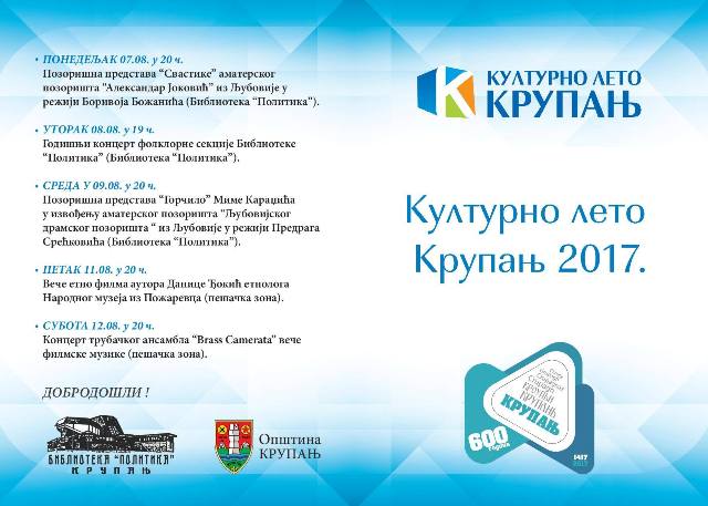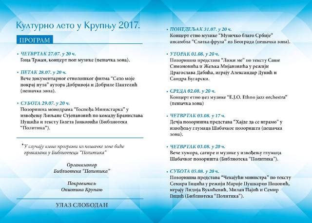 ПРОГРАМ МАНИФЕСТАЦИЈЕ "КУЛТУРНО ЛЕТО КРУПАЊ 2017."