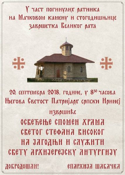 У част погинулих ратника на Мачковом камену и стогодишњице завршетка Великог рата 20.септембра 2018.године, у 8.30 часова Његова Светост Патријарх српски Иринеј извршиће освећење спомен храма Св.Стефана Високог на планини Јагодњи ( код Крупња) и служити свету архијерејску литургију.