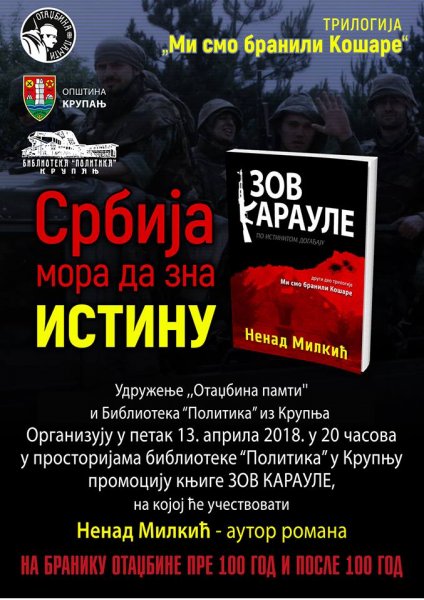 Удружење „Отаџбина памти“ и Библиотека „Политика“ Крупањ организују у петак 13.априла 2018.године у 20 часова у просторијама бибилиотеке „Политика“ промоцију књиге ЗОВ КАРАУЛЕ, на којој ће учествовати Ненад Милкић-аутор романа.