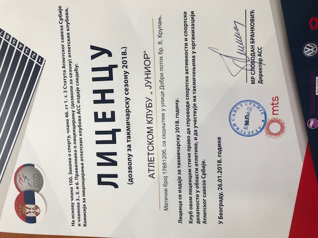 АК"ЈУНИОР" ДОБИО ЛИЦЕНЦУ -ДОЗВОЛУ ЗА ТАКМИЧАРСКУ СЕЗОНУ 2018.