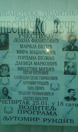 Библиотека "Политика" организује песничко вече у четвртак 25.01.2018.године са почетком у 18.часова. Водитељ програма Љутомир Рундић.