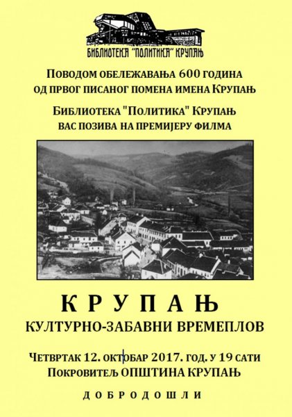 У четвртак 12.октобра 2017.године у 19 часова, поводом обележавања 600.година од првог писаног помена имена Крупањ, бибилиотека "Политика" Крупањ Вас позива на премијеру филма