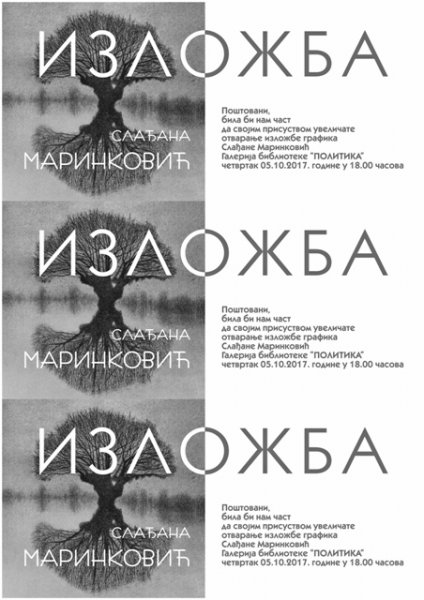 У четвртак 05.10.2017.године у галерији бибилиотеке „Политика“ са почетком у 18 часова, биће одржана изложба графика ауторке Слађане Маринковић.
