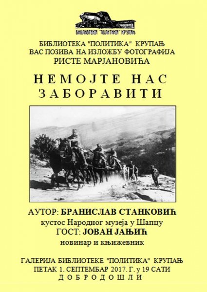 У петак 01.09.2017.године у 19.часова у галерији библиотеке „Политика“ Крупањ биће одржана изложба фотографија Ристе Марјановића. ДОЂИТЕ!