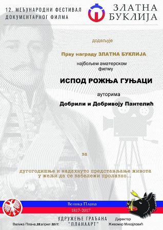 На дванаестом међународном фестивалу документарног филма "Златна буклија 2017." који се у организацији Планум Арта из Велике Плане, а под покровитељством општине Велика Плана од 25. до 28. априла одржава у Великој Плани, прва награда Златна буклија за најбољи аматерски филм припала је филму "Испод Рожња Гуњаци" аутора Добривоја и Добриле Пантелић из Доњих Брезовица код Kрупња.