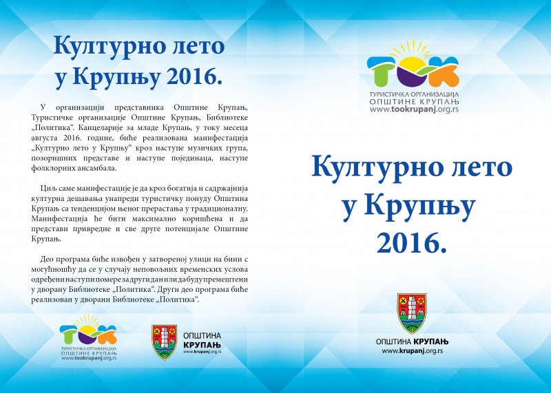 У организацији представника Општине Крупањ, Туристичке организације Општине Крупањ, Библиотеке „Политика“,Канцеларије за младе Крупањ, у току месеца августа 2016. године, биће реализована манифестација „Културно лето у Крупњу“ кроз наступе музичких група, позоришних представа и наступе појединаца, наступе фолклорних ансамбала. Посетите догађаје, а разноврсан програм је у прилогу.