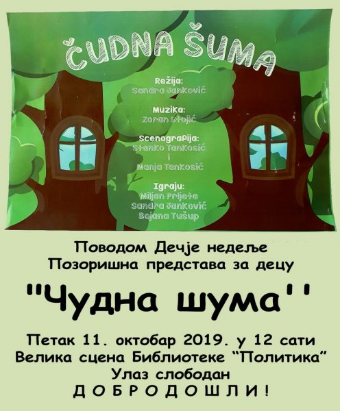 У петак 11.октобра 2019.године у 12 сати поводом Дечије недеље биће одржана позоришна представа за децу "Чудна шума" у Великој сали библиотеке "Политика".