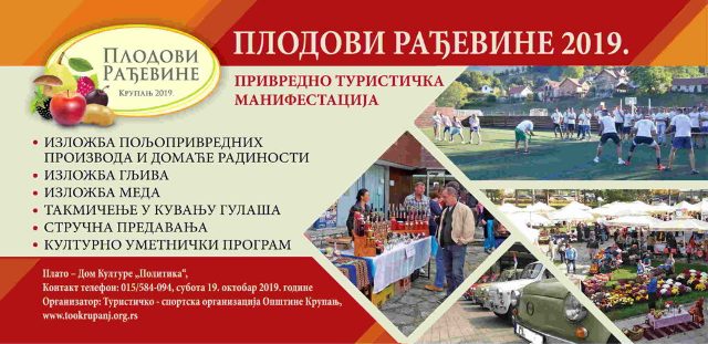 У организацији Туристичко-спортске организације општине Крупањ биће одржана привредно-туристичка манифестација "Плодови Рађевине" у суботу 19.10.2019.године на платоу библиотеке "Политика".Програм манифестације се налази у прилогу ове вести. ДОЂИТЕ!