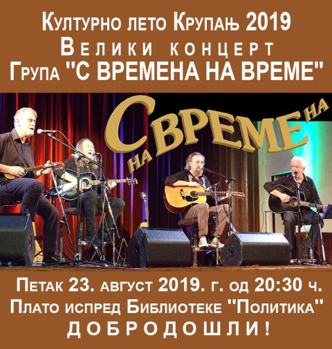 У оквиру манифестације "Културно лето" у петак 23.августа на платоу испред библиотеке "Политика" биће одржан концерт групе "С времена на време" са почетком у 20.30 часова.ДОБРОДОШЛИ!