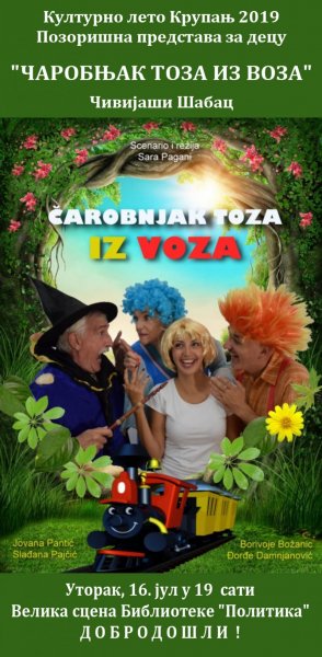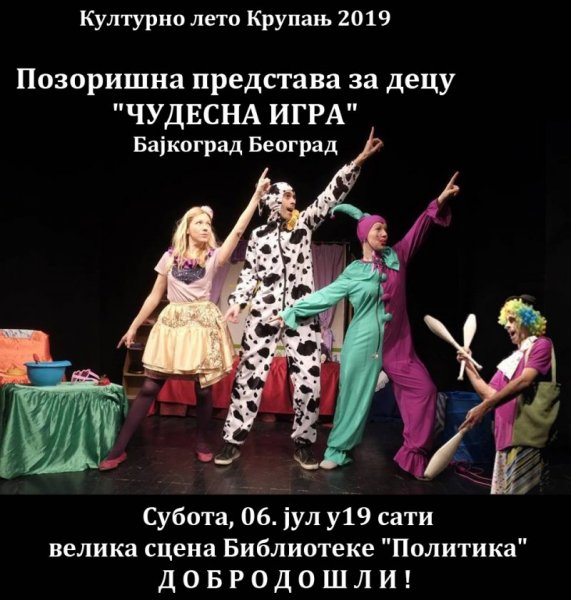 У оквиру манифестације "Културно лето" -Крупањ биће одржана дечија позоришна представа "Чудесна игра" у суботу 06.07.2019.године са почетком у 19 часова-велика сцена библиотеке "Политика". Сала климатизована.Улаз слободан. ДОЂИТЕ!