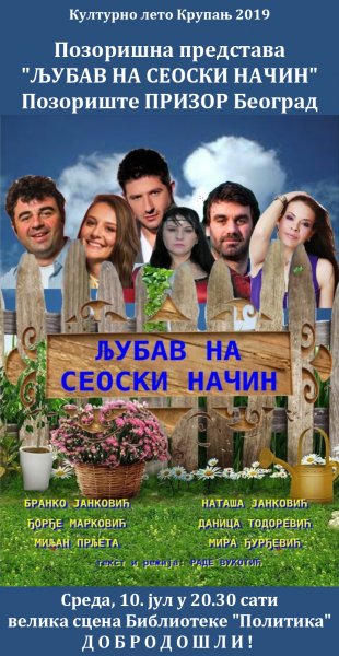 У оквиру манифестације "Културно лето" -Крупањ биће одржана позоришна представа "Љубав на сеоски начин" у среду 10.07.2019.године са почетком у 20.30 часова-велика сцена библиотеке "Политика". Сала климатизована.Улаз слободан. ДОЂИТЕ!