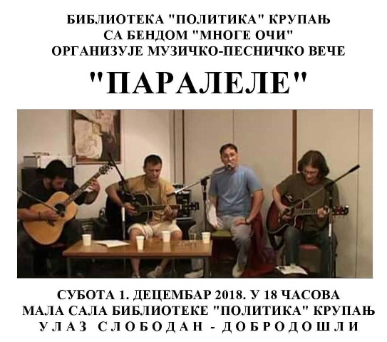 У суботу 1. децембра 2018.године у 18.часова Бибилиотека "Политика" са бендом "Многе очи" организује музичко-песничко вече "Паралеле", у Малој сали Бибилиотеке "Политика" у Крупњу. Улаз слободан,дођите!