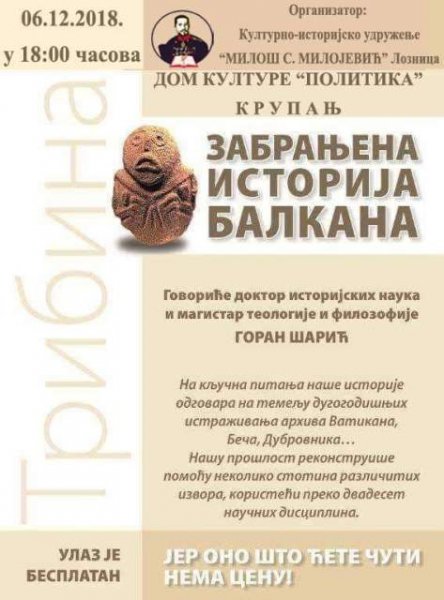 У четвртак 06. 12. 2018. Библиотека „Политика“ у Kрупњу организује трибину о Забрањеној историји Балкана. О занимљивој теми на трибини ће говорити Горан Шарић, доктор историјских наука и магистар Теологије и Филозофије . Почетак трибине је у 18.00 часова. Улаз је слободан.