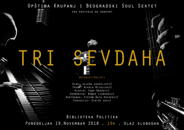 У понедељак 19.11.2018.године са почетком у 19 часова у библиотеци “Политика”у Крупњу очекује вас несвакидашњи концерт београдског соул бенд “Три севдаха”.Улаз је слободан!Дођите!