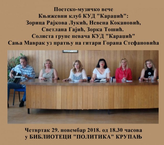 У четвратак 29.11.2018.године са почетком у 18.30 часова у библиотеци "Политика" у Крупњу биће одржано поетско-музичко вече.Улаз је слободан,дођите!
