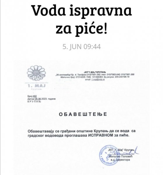 ЈКП "1.Мај" Крупањ обавештава грађане да се вода са градског водовода проглашава ИСПРАВНОМ за пиће.